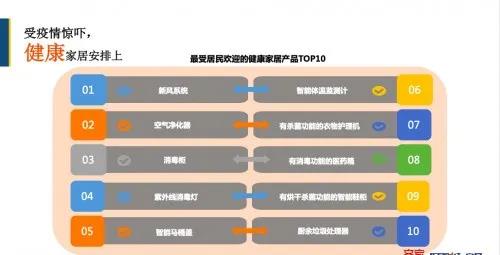 值得注意的是TOP榜中,消毒類健康家居產(chǎn)品多達(dá)到6種,分別是消毒柜、紫外線消毒燈、智能馬桶蓋、有殺菌功能的衣物護(hù)理機(jī)和有殺毒功能的智能鞋柜。同時(shí)也說明了,在家庭環(huán)境中,用戶對(duì)居家衛(wèi)生情況有了深刻認(rèn)知,關(guān)注度幾乎空前。