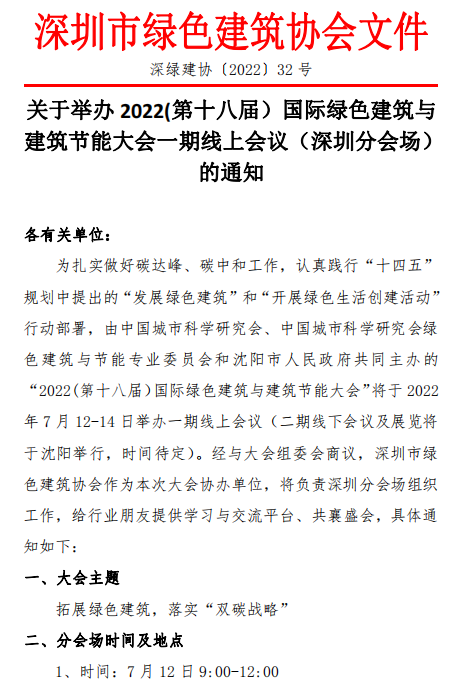 關(guān)于舉辦 2022(第十八屆)國(guó)際綠色建筑與 建筑節(jié)能大會(huì)一期線上會(huì)議(深圳分會(huì)場(chǎng)) 的通知