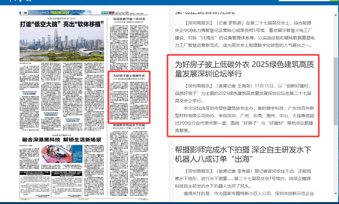 繼成功舉辦“2024綠色建筑高質(zhì)量發(fā)展深圳論壇”,協(xié)會在本屆高交會C3未來建筑大會期間繼續(xù)打造以“高質(zhì)量發(fā)展”為核心的品牌論壇,獲得媒體界朋友的高度關注。深圳特區(qū)報、深圳商報、新浪新聞等權(quán)威及主流媒體均在第一時間對論壇成果進行了追蹤報道,引發(fā)社會及行業(yè)內(nèi)的廣泛關注。