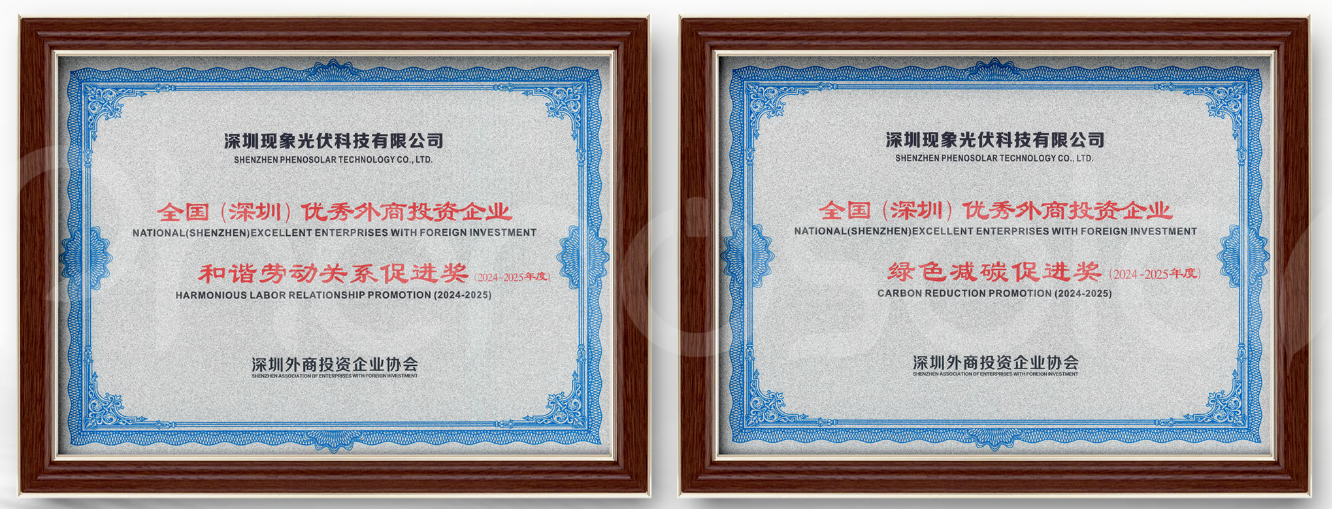 近日,在深圳外商投資協(xié)會主辦的“2025年全國(深圳)優(yōu)秀外商投資企業(yè)”表彰大會上,深圳現(xiàn)象光伏科技有限公司一舉斬獲“和諧勞動關(guān)系促進(jìn)獎(jiǎng)” 與“綠色減碳促進(jìn)獎(jiǎng)”雙重殊榮。該評選自1989年起已連續(xù)舉辦36屆,是國內(nèi)外商投資領(lǐng)域極具權(quán)威性的品牌活動。本屆從深圳逾1.75萬家外資企業(yè)中優(yōu)中選優(yōu),僅191家企業(yè)脫穎而出。現(xiàn)象光伏能同時(shí)斬獲雙獎(jiǎng),標(biāo)志著其在“內(nèi)部治理”與“綠色創(chuàng)新”兩個(gè)維度均達(dá)到行業(yè)標(biāo)桿水平,贏得了高度認(rèn)可。