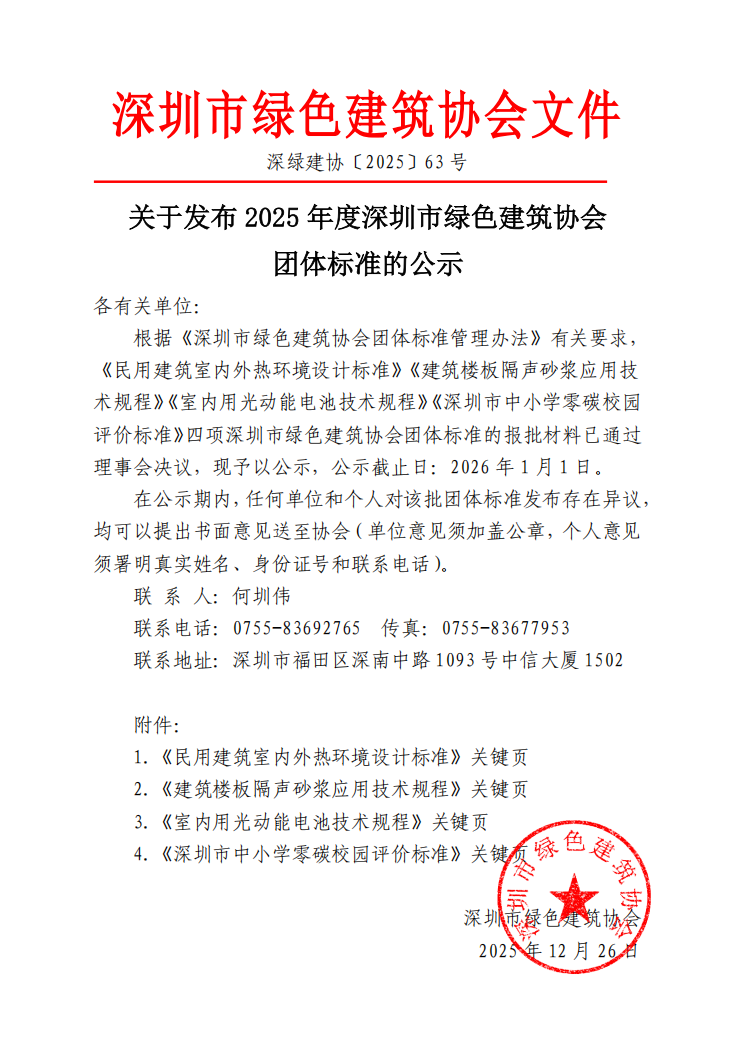 關(guān)于發(fā)布2025年度深圳市綠色建筑協(xié)會(huì)團(tuán)體標(biāo)準(zhǔn)的公示