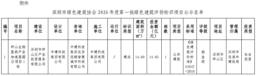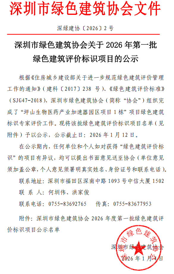深圳市綠色建筑協(xié)會關(guān)于2026年第一批綠色建筑評價(jià)標(biāo)識項(xiàng)目的公示